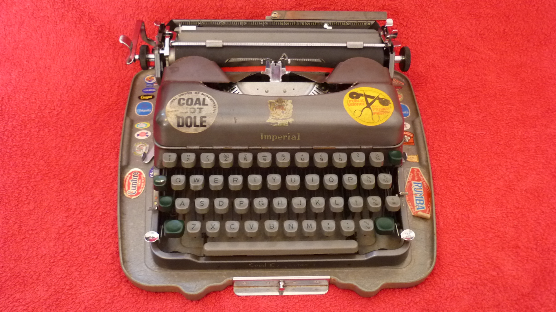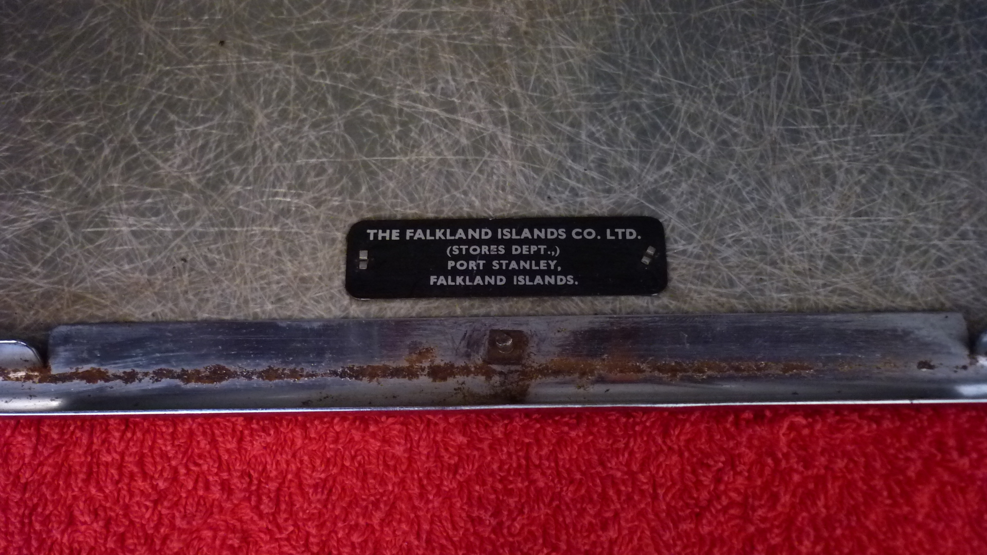 This particular machine has led an interesting life. It had belonged to the owner's father who was a lifelong Communist, and had travelled the world with him. It is thought that it had even been to Cuba at one time. Obviously passionate about his beliefs, dad had adorned the machine with stickers. One refers to the 1980's coal miners strike, the other one on the ribbon cover is to do with the privatisation of Britain's government-owned telephone system into the firm now known as BT. He certainly liked his citrus fruit, since the machine's baseboard has many stickers taken from various fruits. And then there is where the machine began it's life. How many typewriters have you ever seen that were supplied in the Falkland Islands ? Have a look at the supplier's plate in the right hand picture ! A full service and some new baseboard feet (happily identical to those on the 1930's Imperial Good Companion so I had reproductions in stock) brought the machine back to life. What a wonderful heirloom !
