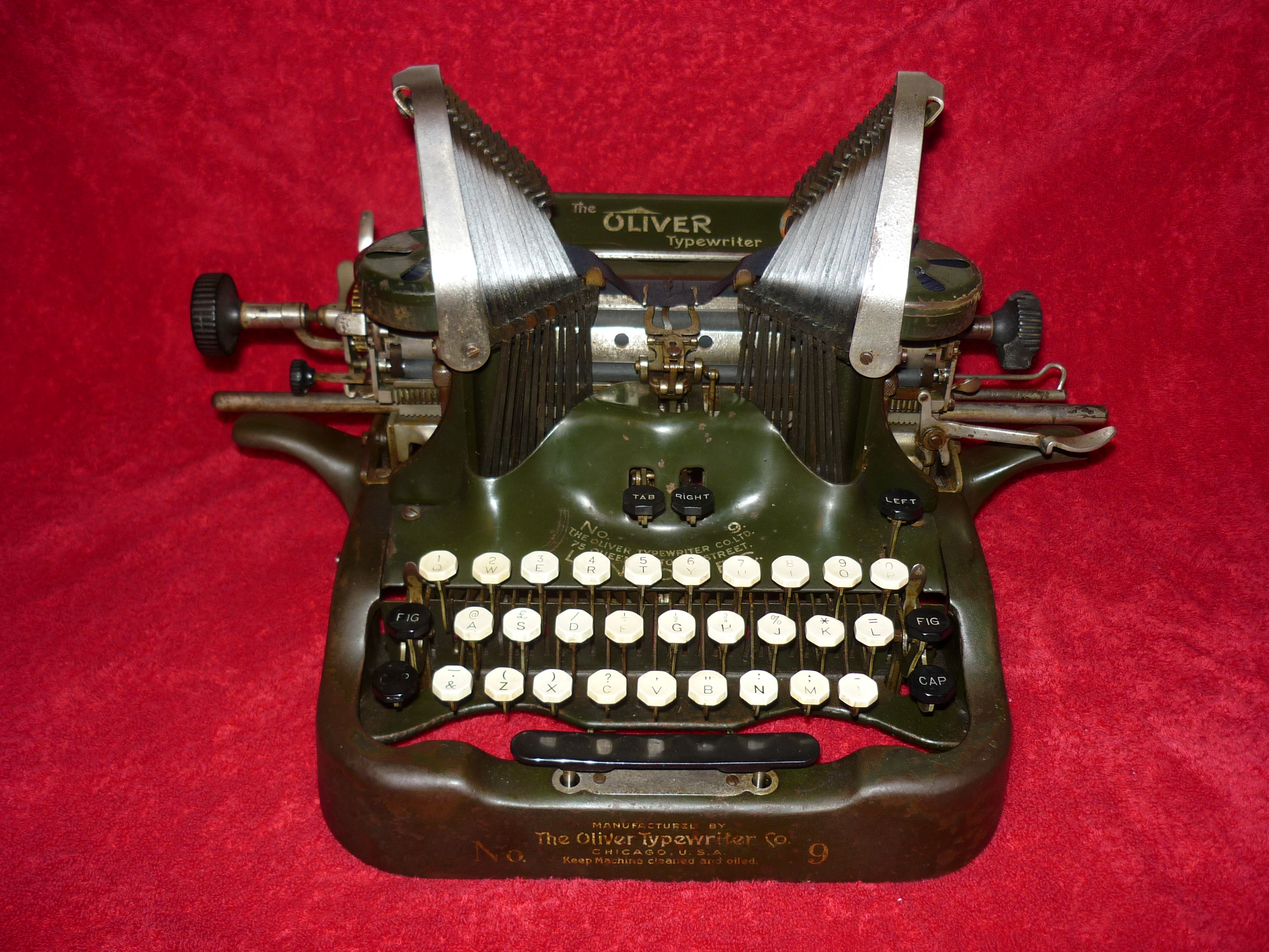 You could say that the Oliver typewriter was the 'Apple Mac' of its' day. It performed all the functions that you you would expect a typewriter to perform, but did so in an entirely different way to any other typewriter. The inventor of this machine was the Reverend Thomas Oliver who lived in a remote part of Canada. He had heard of typewriters when they were newly invented, but had never seen one. Thus, when he designed his, he had no pre-conceived ideas and simply went his own way. It is even said that when constructing the prototype, he used strips cut from large tin cans to make the typebars ! The machine proved to be such a successful design that by 1895, he had left the church and with the help of American investors, started the Oliver Typewriter Company. One of the revolutionary things about this machine is that because the typebars swing in from each side you can actually see what you are typing, as you are typing it. Of course you can do this on any modern typewriter, but for the first thirty years that typewriters were being made, on the vast majority of makes this wasn't possible.