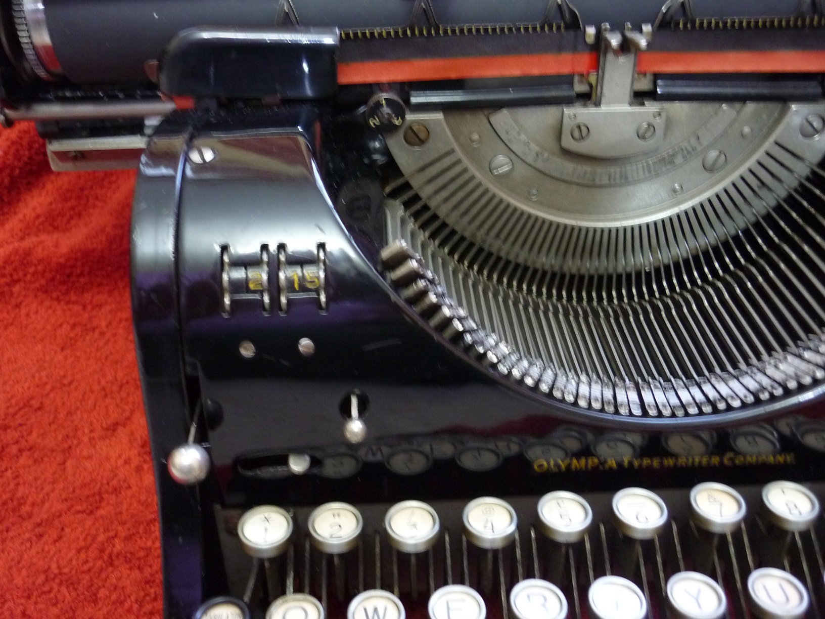 Just like the Imperial typewriter company here in England, Olympia continued to produce typewriters throughout the war, and afterwards. This 1946 model was intended for the British market, hence having an English keyboard. The original purchasers must have felt somewhat conflicted, having bought a machine manufactured by a country that had been the enemy only a year before. But it has to be put into the context that there was a terrific shortage of typewriters for many years after the conflict, and maybe a German machine was better than no typewriter at all. They need not have worried about the durability however. The fit and finish is second to none. Except for just one thing. There were post-war shortages of materials in Germany just as in the UK. The seemingly insignificant collars that support the ribbon reverse mechanisms, were brass castings in pre-war Model 8s, but the post-war versions featured collars made from Mazak - a poor-quality aluminium-based casting material that slowly disintegrates after a few decades. This, sadly, is the Achilles heel of these machines although fortunately they still appear to be intact in the machine shown in the photos. Another indication of the shortage of materials (also often seen in British typewriters of the same era) is the cork platen and feedrolls. Cork was an alternative to rubber - more durable but with the trade-off of less grip on the paper. The platen is almost certainly the original, now 79 years old and still perfectly servicable. Rubber goes hard and then cracks over a similar timescale.