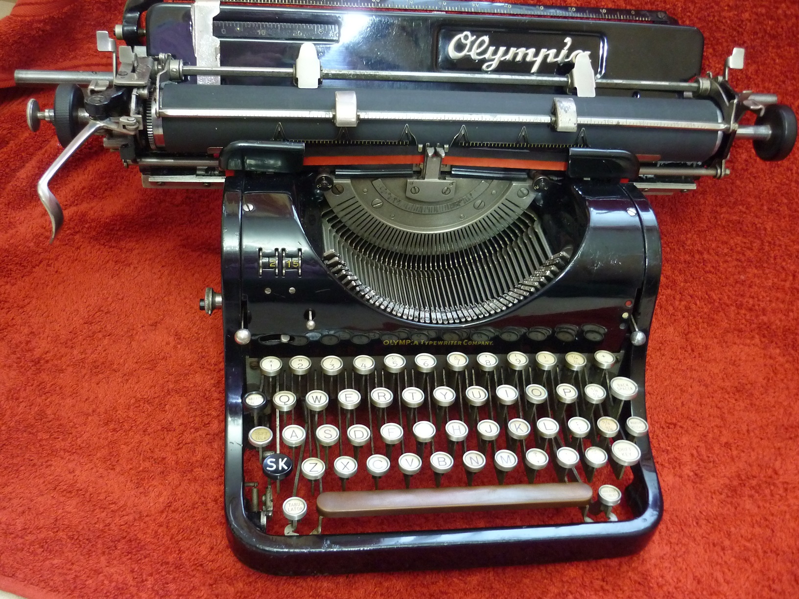 The German maker Olympia were always a rather conservative manufacturer, so it was rather a surprise to find an integrated date calendar built in to a mid-1930's office typewriter. This is definitely not a third-party accessory. The way it has been seamlessly fitted into the front of the machine marks it out as a factory job. It isn't automatic of course. You have to roll the wheels to reset the date each morning, but it is certainly a handy feature, saving you having to look up at a desk calendar whilst you are working. I really do not know why it didn't catch on. I have never seen another one, on an Olympia or any other make. Perhaps it was an option for one year only ?