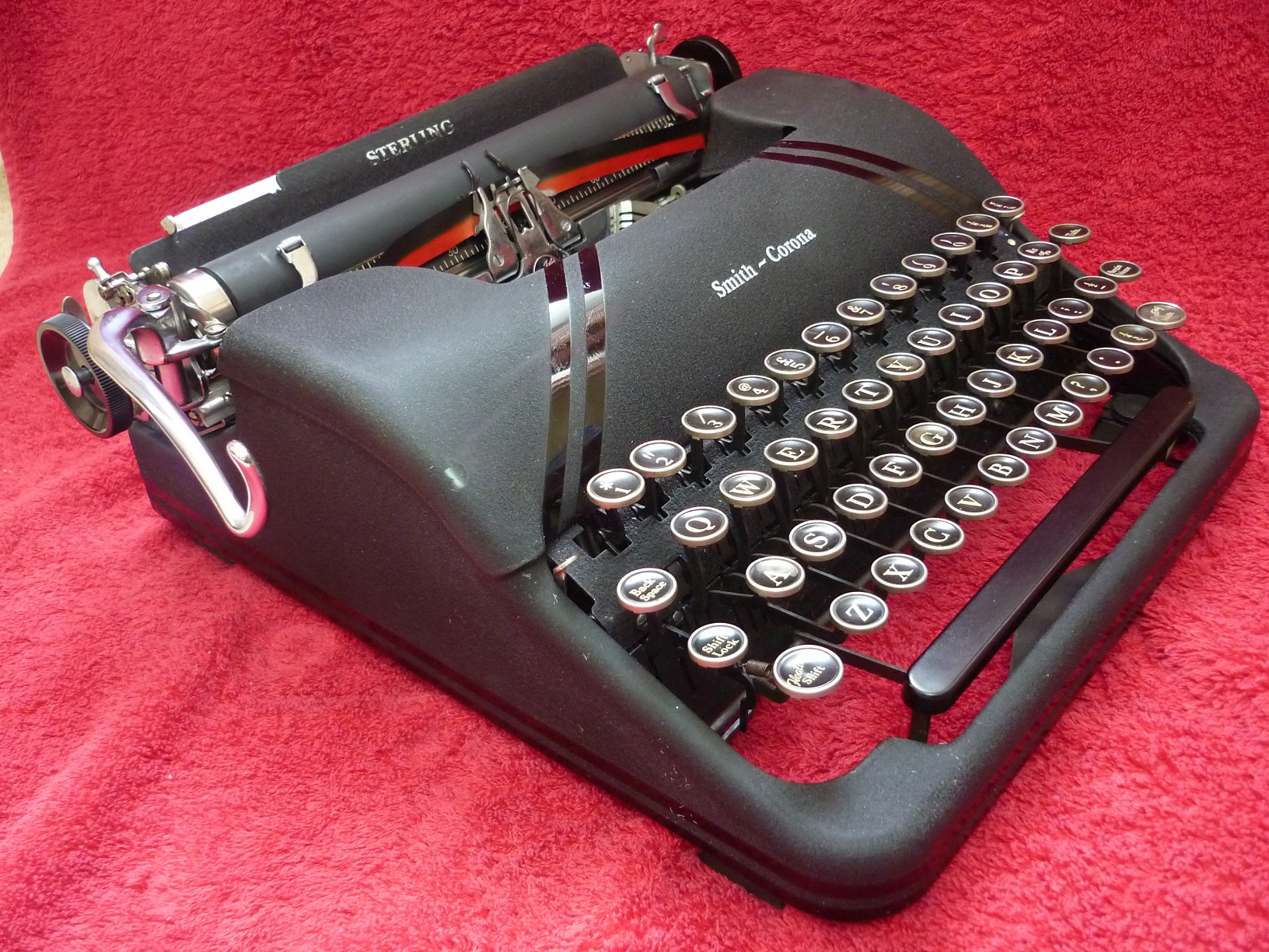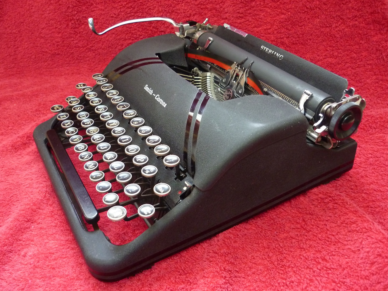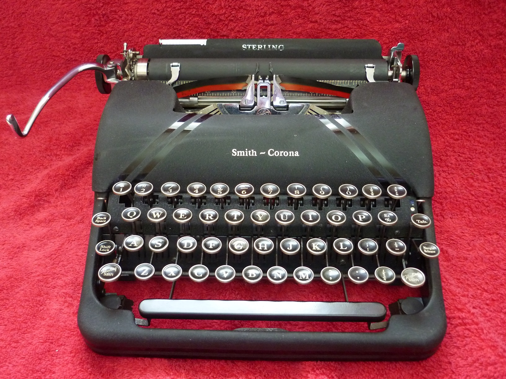 The mechanical origins of the machine in the photos began in 1931 with a completely new design of four bank (four rows of keys) portable with a segment shift. Smith Corona called this their 'Floating Shift' system and it became the prototype of a line of typewriters which survived in production, although much modified) until 1980. The original 'flat top' Corona can be seen at 'Typewriter of the Month March 2023' if you would like to compare it. When Remington brought out their 'Streamliner' portable in 1939 with new rounded lines, Smith-Corona felt bound to design something similar. The 4A series Sterling in the pictures above were the result. Note the classy gloss black 'racing stripes' superimposed over the (then new) black crackle finish of the casing.