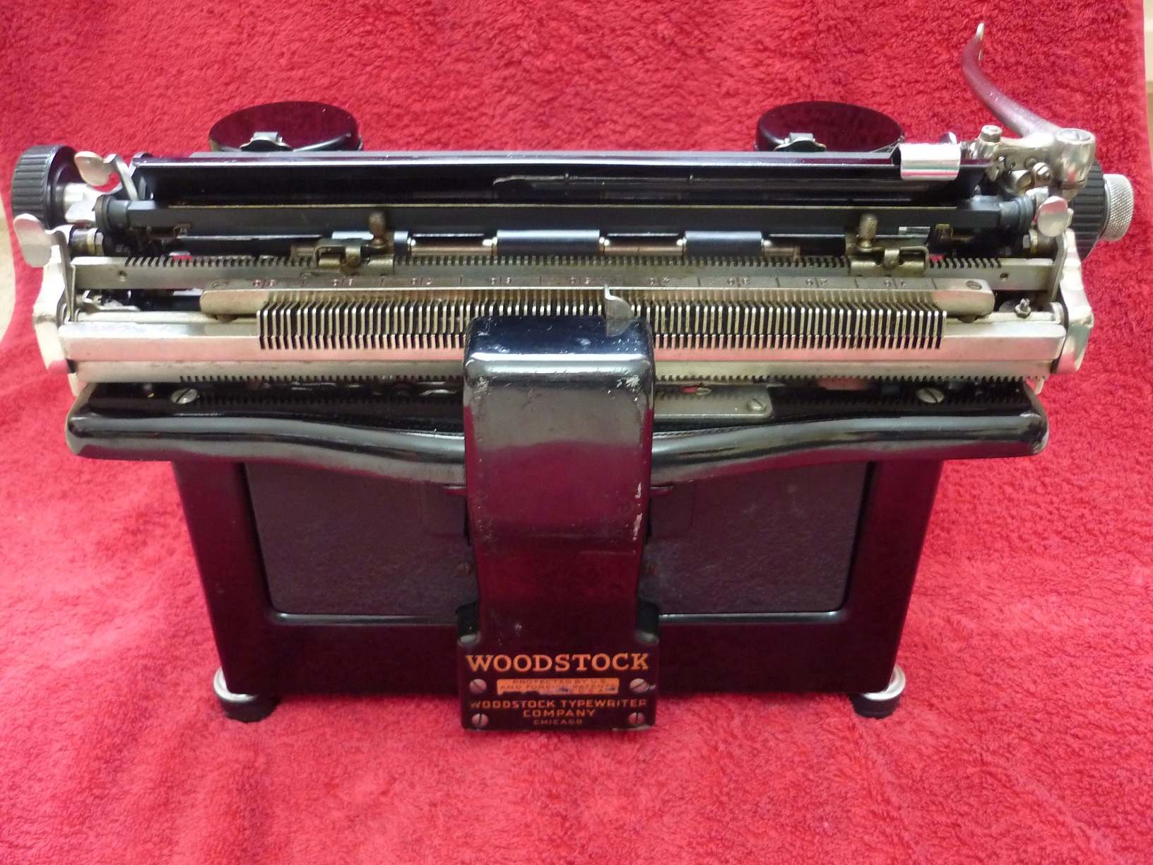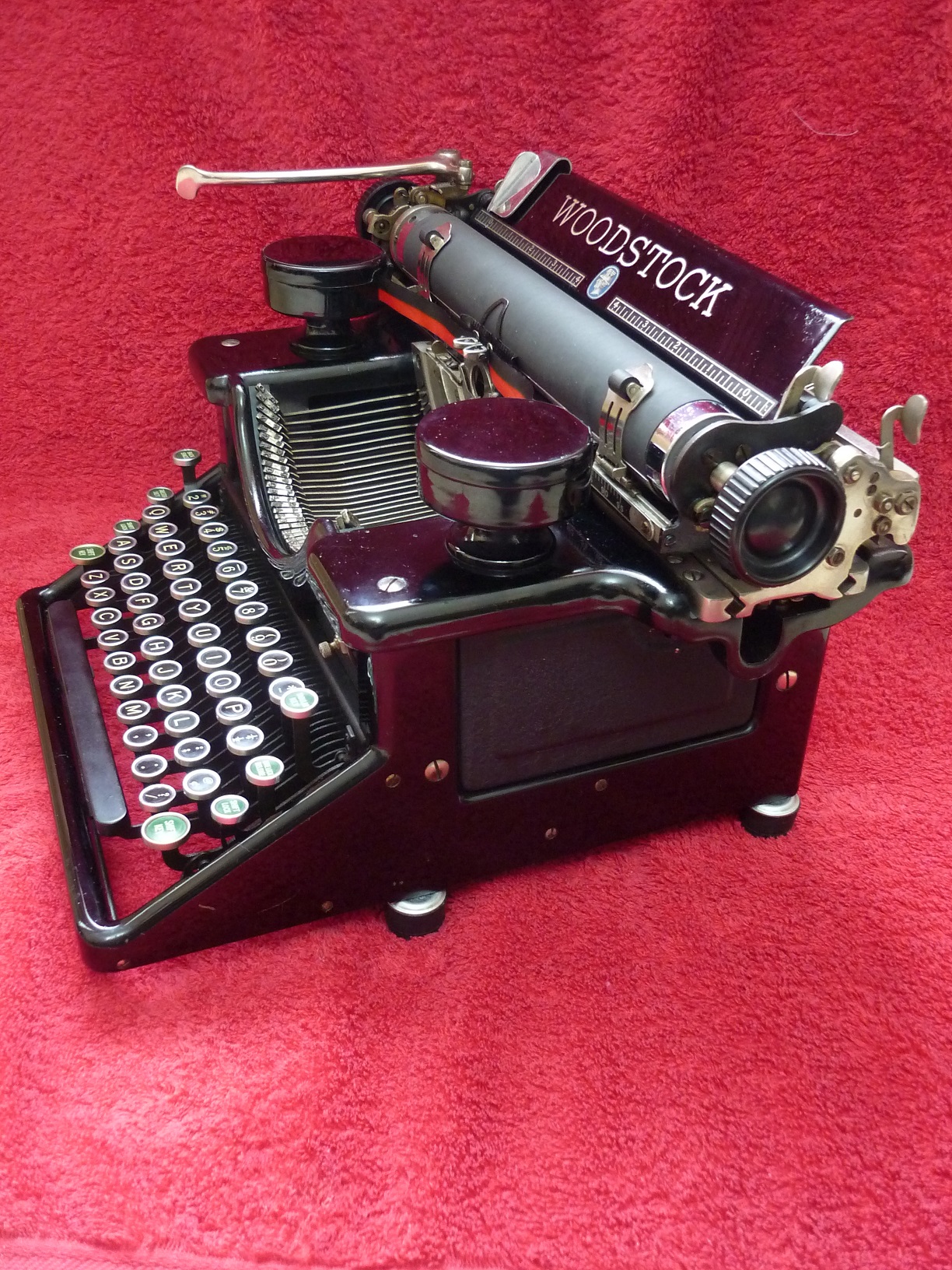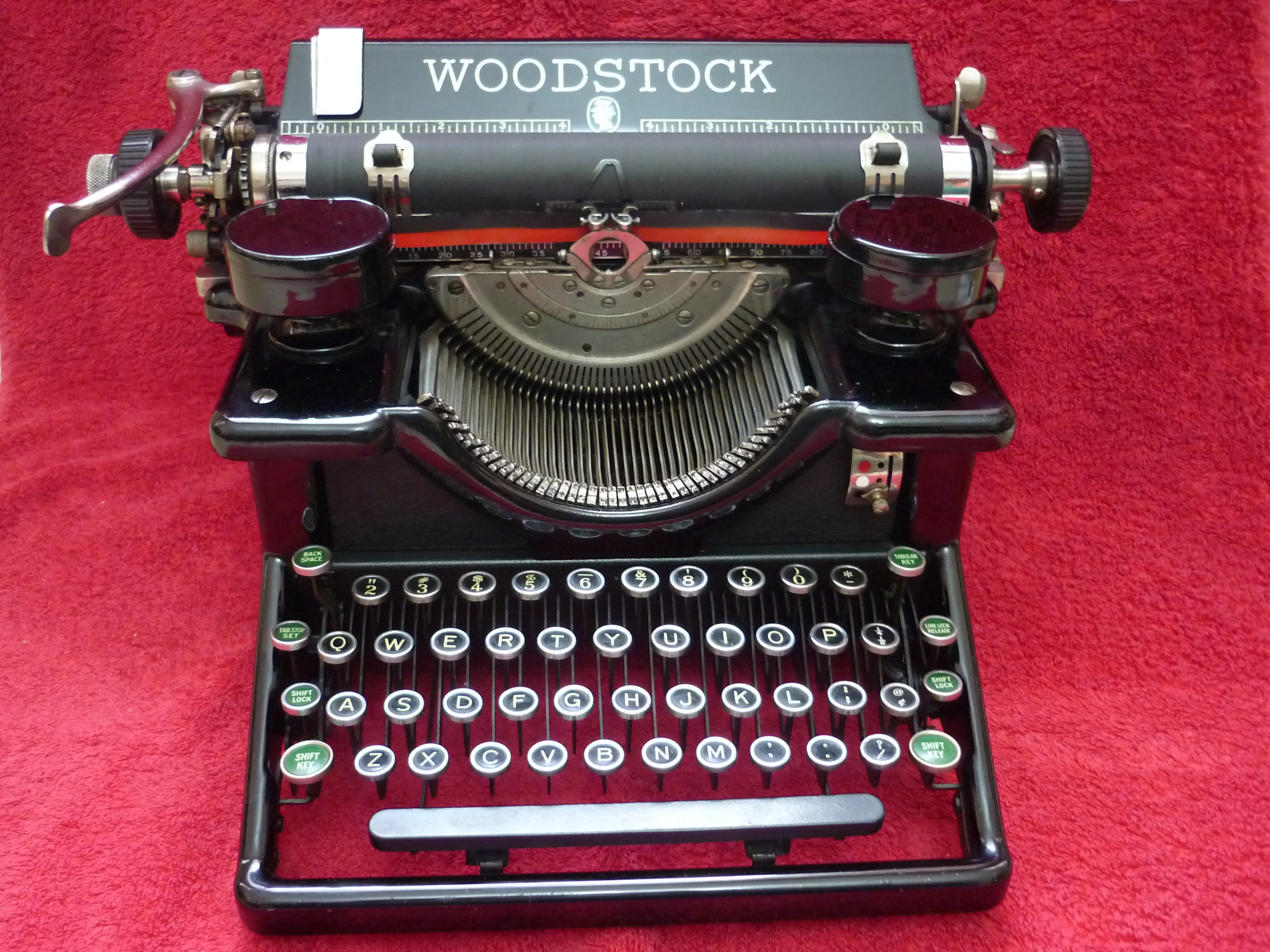 Although Woodstock typewriters were imported to the UK until World War II, and were reasonably popular, they were never sold here after the war. This mid-1930's machine is a direct American import, and has a US-specification keyboard without a '£' symbol.