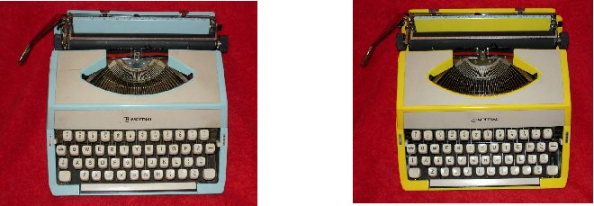 A. I can help ! As long as the casings on your machine are metal (some later machines had plastic casings), I can dismantle and refinish your typewriter to ANY colour you desire ! I aim to make the machine look as if it was originally manufactured in the new colour. The pictures below show 'before' and 'after' views of a machine where I changed the colour from blue to yellow.