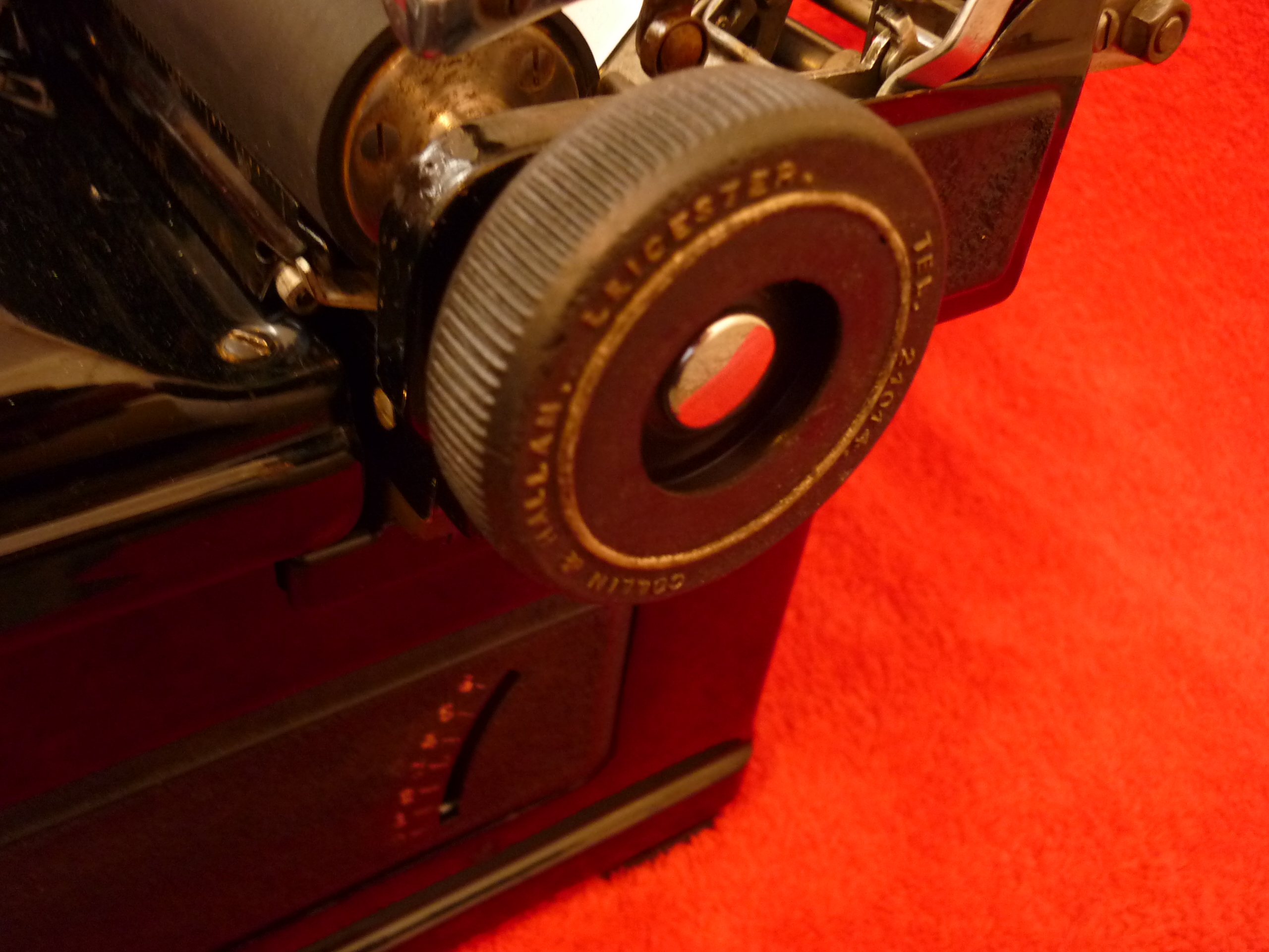 The picture above shows a rubber ‘over shoe’ that fits over the platen knob. This arrived attached to the right hand knob of a 1936 Royal KHM office typewriter. Clearly there must have once been a similar shoe over the left knob, but that one had dissolved into a mass of sticky rubber. I must admit to being intrigued. You never stop learning in this trade, and I have never seen another. The raised wording on the rubber says, ‘ COLLIN AND HALLAM. LEICESTER. TEL. 21014.’ Whether this is the maker, or more likely, an enterprising typewriter dealer who had their name moulded onto the ‘shoe’, I really couldn’t say. I wonder if anyone would answer if you tried to ring that number now ? The purpose of the ‘shoe’ was probably three-fold. If it was a typewriter dealer’s name, then it would be an excellent form of advertising. If you were typing large quantities of, say, record cards – the increased diameter of the platen knob would ‘gear up’ the turning of the knob. This would allow the card or paper to be fed into the machine quickly. And of course, a nice soft rubber grip would be easier on the hand than a hard Bakelite knob when used repeatedly in the course of a working day.