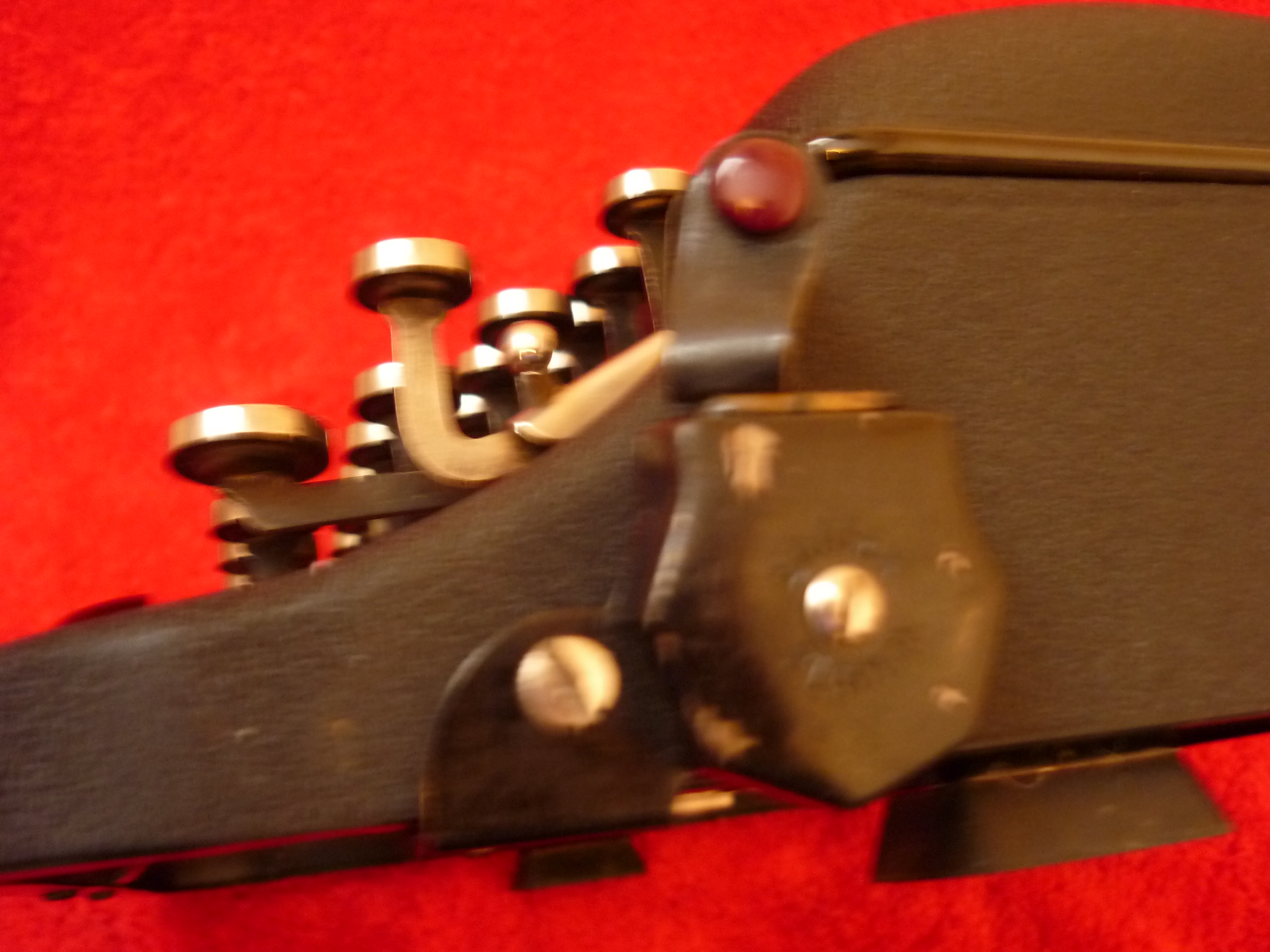 Wherever there is a problem, someone somewhere comes up with a solution. And here it is ! A handy spring-loaded cord with an attachment that goes through the rivet hole in the middle of the eraser ! With the device held to the side of the machine with a chromium-plated thumbscrew, you can pick the eraser out of its 'pocket', use it, and when released it will return to its rest position in the same way as a tape measure retracts into its case ! Rather ingenious, don't you think ?