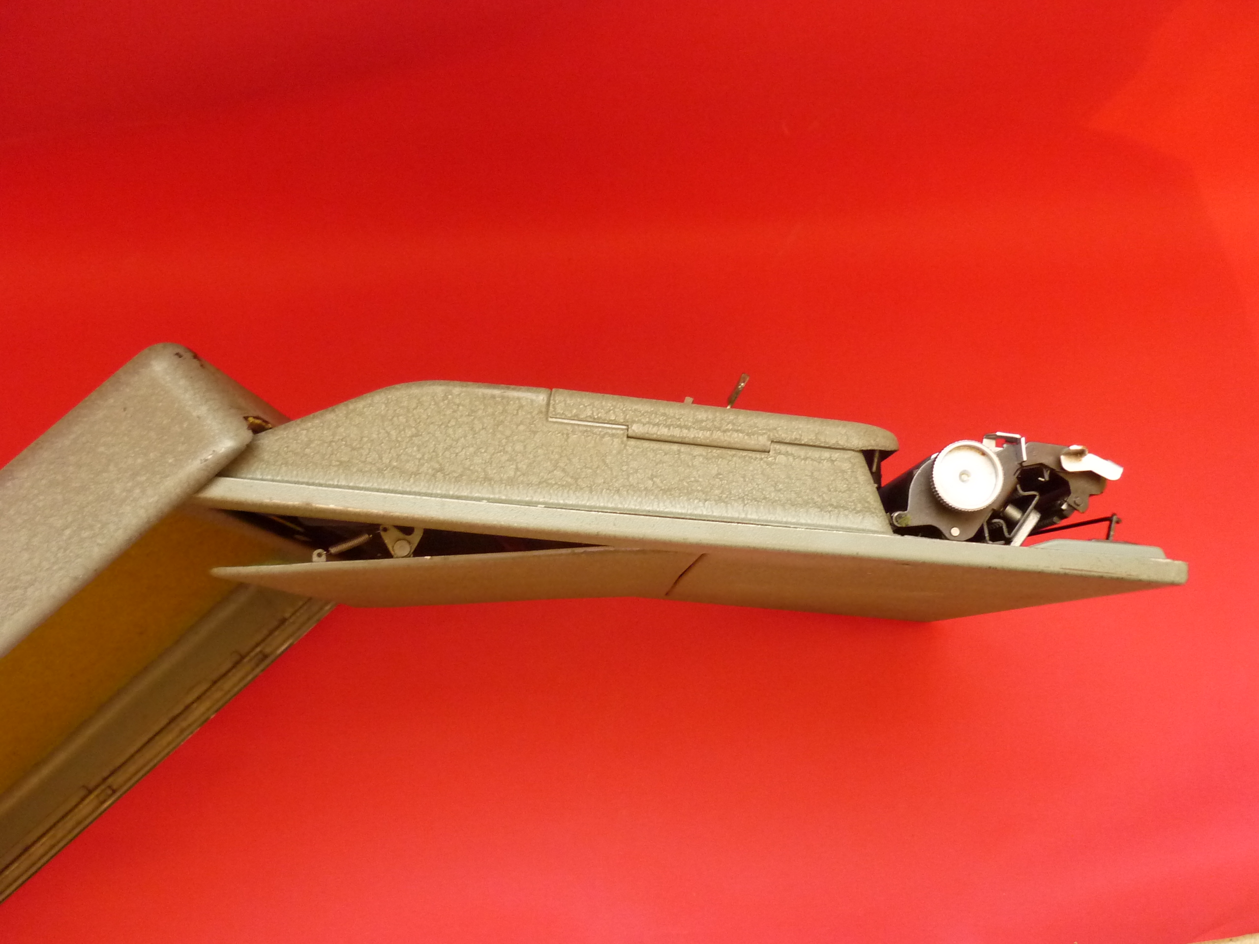 Rooy's take on the concept was to produce a machine that was incredibly flat whilst in it's carry case and when in use the carry case slid over the front of the machine and tucked underneath, whilst a flap dropped down underneath the keyboard to allow enough room for the keys to be pressed down fully. The pictures really illustrate this better than I can describe. 'Rooy' is pronounced 'Roy' in French and this eventually attracted the attention of the Royal Typewriter Company in America, who objected to a name so close to their own and threatened legal action. I believe that the attempt to get Rooy to change the name failed.