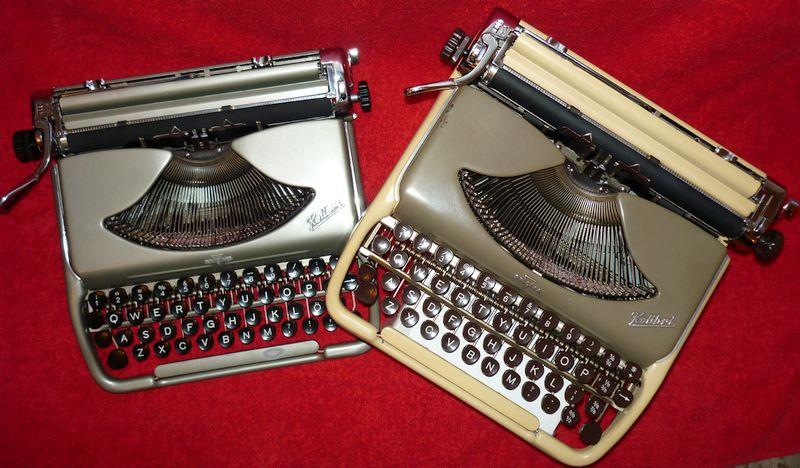 Maybe rare typewriters are like buses and come along in threes ! The mysterious Groma Kolibri is something of a legend amonst typewriter collectors, and very sought after. A product of East Germany in the 1950's and early 1960's, not much is known about the manufacturer. I have been in the typewriter trade since 1975, and until a couple of months ago, had only ever seen pictures of these machines. Then one of my customers was given a rare English-keyboard version (the machine on the right) by a relative who was having a clear-out - how lucky was that ! Once his appetite was whetted, he bought another German-keyboard version from a well-known internet auction site. That one came from Latvia ! Both were sent to me, the English one for repair, servicing and to have the carriage end covers re-chromed. The German keyboard machine was near perfect and just needed the 'Y' and 'Z' typeface and keytops swopped over to make it into pseudo-English machine. Almost simultaneously, another customer brought me a German-keyboard Groma (the machine on the left) to be repaired and the keyboard converted in the same way. So now I know my way around a Groma ! I can report that although beautifully made, these machines are a real 'nuisance' to work on ! For an ultra-flat portable typewriter, they are also surprisingly solid and heavy !