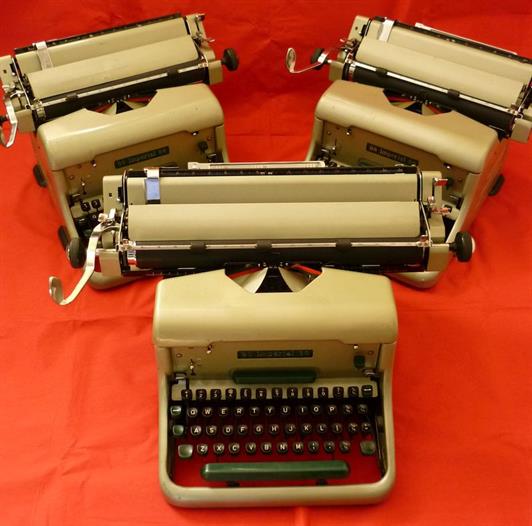 These three machines were the result of a TV commission ! I was tasked with finding them to populate the desks of a late 1960's British police station to appear in a forthcoming period detective series. One was restored to pristine 1969 condition - even down to the correct period metal ribbon spools - for close-up shots. A second one to full working order for longer shots. The third one just to sit about on a desk or filing cabinet and look pretty, but not necessarily to work. I also had to find an Imperial portable - actually a 1959 an Imperial Good Companion Five. Film and TV companies always want things about a week before they first thought of them, and true to form this was a panic job. Much midnight oil was burnt, and what you see here was photographed about an hour before they were collected by the courier !