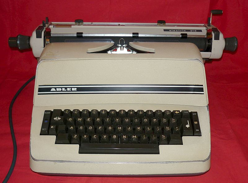 Back in the mid-1970's, there were only three electric typewriters worth having. The IBM Model C or D, the Olympia SGE 50 and the Adler 21d. Of the three, both the IBM and the Adler were designed from the ground up as electric typewriters. The Olympia was at least partly based on the Olympia manual typewriter and shared many of its components. The surprising thing about any electric typewriter is that it is 99% mechanical. The parts that thrust the typebars up towards the paper are mechanically operated, using an electric motor as the driving force. Often, but not always, an electric typewriter is equipped with a special single-use carbon ribbon. Almost like carbon paper on a roll, but actually on a thin plastic film, the carbon ribbon provides very sharp and clear writing. Combined with the electric typewriter's naturally even impression, it can give the work an almost printed appearance. A standard fabric ribbon, as normally found on a manual typewriter and selected by the flick of a switch, can be used for less important work. Adler electric typewriters were made in Germany from the late 1950's right through to the late 1970's when they were superceded by 'golfball' models. Incredible 'maids of all work', they were to be seen in offices everywhere.