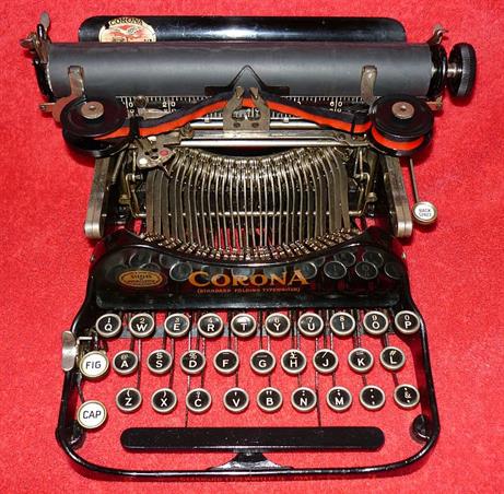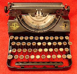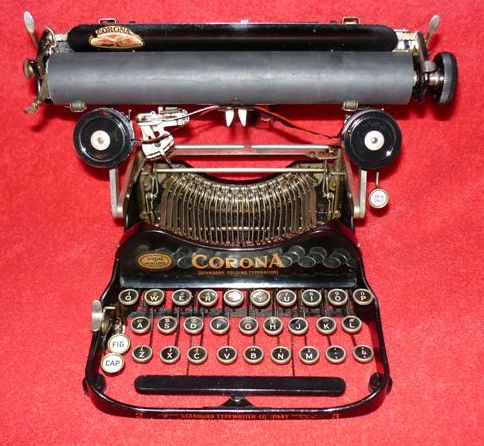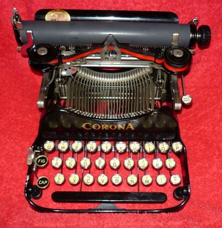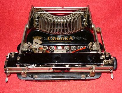 The first Corona Threes were made as early as 1909, athough the machine was originally called the 'Standard Folding Typewriter', manufactured in America by the Rose Typewriter Company. Unfortunately, the firm was under-capitalised, and the manufacturing rights were soon sold to a group of businessmen. With sufficient money behind the scheme, production was expanded and the little machine started to gain a significant share of the market. By 1914, the firm had been re-named the Corona Typewriter Co., and the machine became the Corona Three. A simple, lightweight portable typewriter, the trademark of the Corona Three was that the whole carriage was hinged so that it folded down over the keyboard when not in use. This meant that it could be placed in a much smaller carrying box than would otherwise be needed. In order to reduce the number of working parts to a minimum, the machine had three rows of keys and a double shift - one for capital letters, and a second for numerals and symbols. It was a very clever design, but as a one-model manufacturer, Corona had too many eggs in one basket. By 1924 they had realised that they could not survive by making just the one model. Customers were beginning to demand a keyboard with four rows of keys, as found on office-sized typewriters.