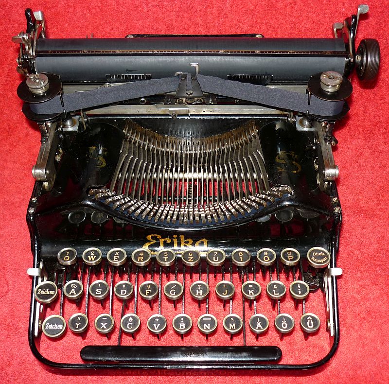 If you take a look at the January 2016 'Typewriter of the Month', you will see another typewriter that looks very much like this one. This is no accident. In the way that the Japanese began their career in manufacturing by copying other countries' successful products, the Germans did the same. The machine that was copied by Siedel and Naumann in this instance was the USA-made Corona Three. There are plenty of detail differences of course. For the technically-minded, the escapement is a wheel one, rather than the Corona's direct-to-rack version. When the carriage folds over, it does so onto little hingeing brackets, set either side of the keyboard. The ribbon is an unusual 5/8" width, rather than the normal 1/2", and the spools are different. But so many things are the same. The method of ribbon transport and reverse are very similar, and the Erika also has only a single feedroll under the platen. The typebars are likewise on separate bearings - just like the Corona Three of the same period.